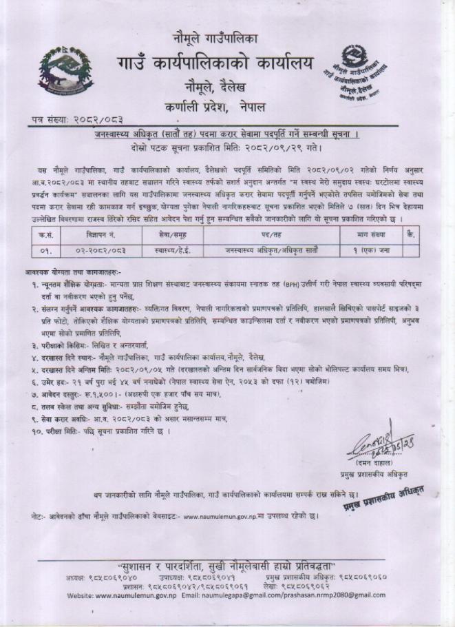 जनस्वास्थ्य अधिकृत (सातौं तह) पदमा करार सेवामा पदपूर्ति गर्ने सम्बन्धी दोस्रो पटक सूचना प्रकाशित मिति: २०८२/०९/२९ !!