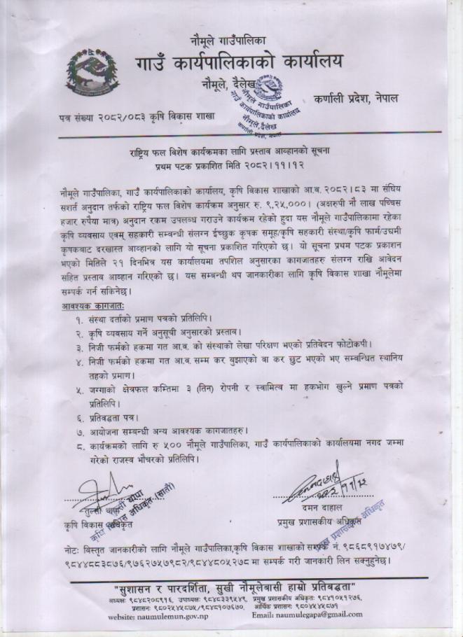 राष्ट्रिय फल विशेष कार्यक्रमका लागि प्रस्ताव आव्हानको सूचना !!