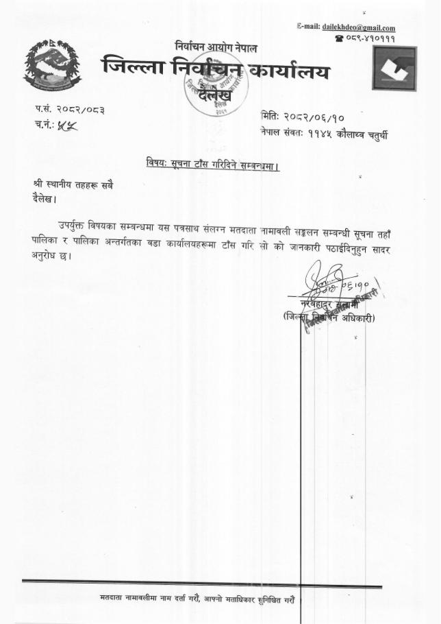 जिल्ला निर्वाचन कार्यालय दैलेखको मतदाता नामावली संकलन सम्बन्धी सूचना टाँस गरि प्रचार प्रसार गरिदिने सम्बन्धी सूचना !!