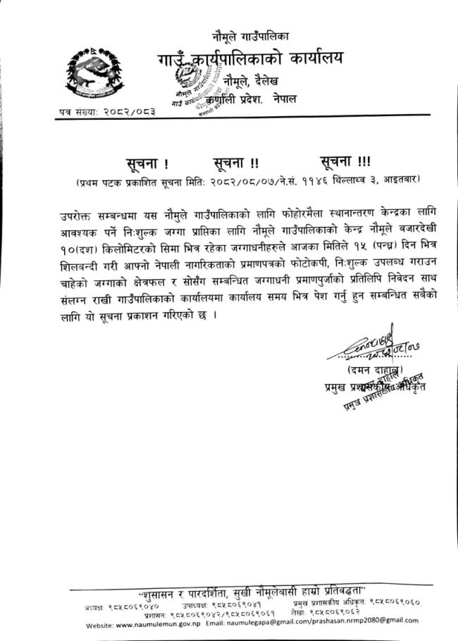 फोहोरमैला स्थानान्तरण केन्द्रका लागि नि:शुल्क जग्गा प्राप्तिका लागि १५ दिने सूचना !!