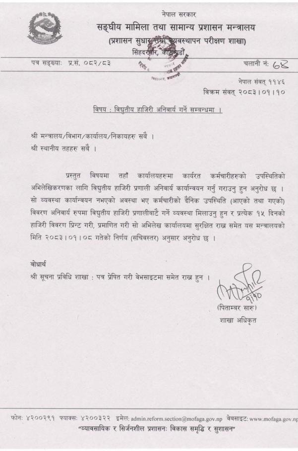 मन्त्रालयको परिपत्र: विधुतीय हाजिर अनिवार्य गर्ने सम्बन्धी सूचना !!