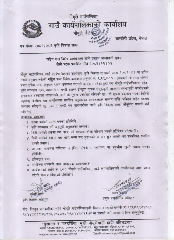राष्ट्रिय फल विशेष कार्यक्रमका लागि प्रस्ताव आव्हानको दोस्रो पटक प्रकाशित सूचना मिति २०८२/१२/०३ !!