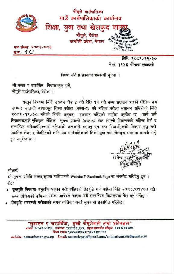 शैक्षिक सत्र २०८२ सालको आधारभूत शिक्षा परीक्षा (कक्षा ८) को नतिजा प्रकाशन सम्बन्धी सूचना !!