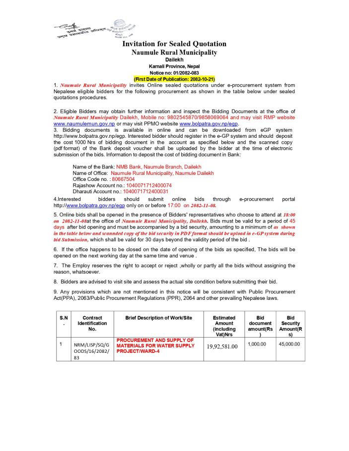 Invitation for Sealed Quotation for procurement and supply of materials for water supply project, ward 4 !!